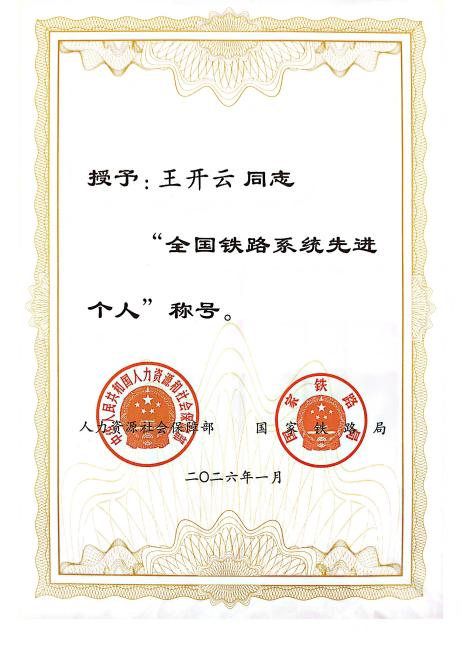 1月9日,全国铁路系统先进集体和先进个人表彰大会在京举行,av线上 主任王开云荣获“全国铁路系统先进个人”称号。